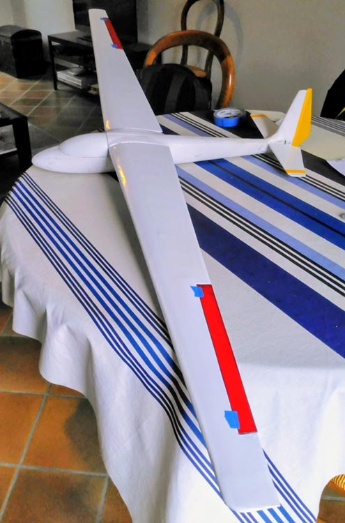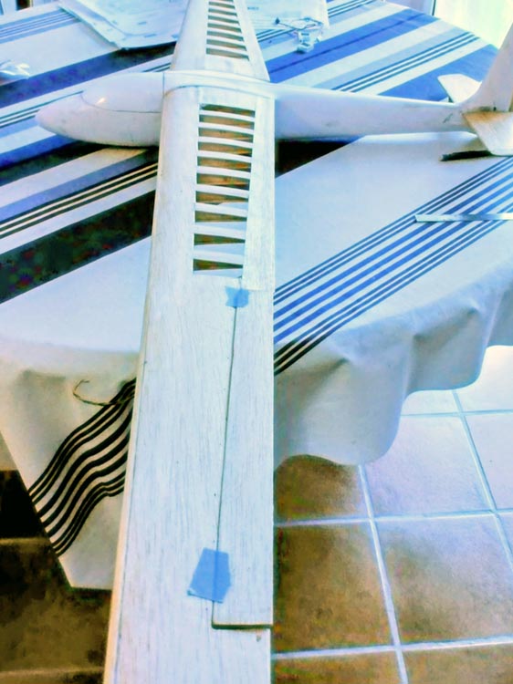 Il a fallu calculer le dièdre de 2,5 ° et en tenir compte sur les trous des fourreaux de clé d'ailes des 3 premières nervures d'emplanture.