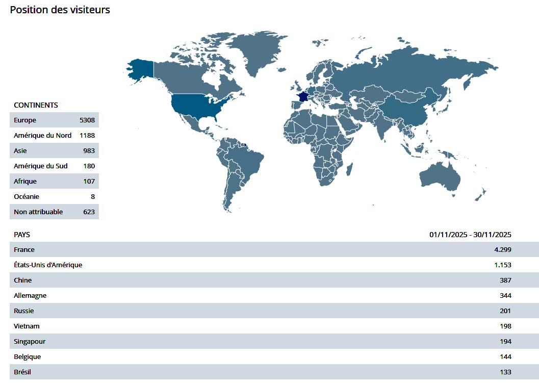 STATISTIQUES du SITE mach34.fr En septembre et octobre, il y a eu un bug qui donnait respectivement 14 400 et 16 650 visites. La correction a été faite !) La France arrive en première position avec 51,20% soit 4 299 visites en novembre 2025.sur les 7 669 visites du mois. Ci-dessous, on voit bien la dominance de Chrome comme Navigateur, bien loin devant Edge !